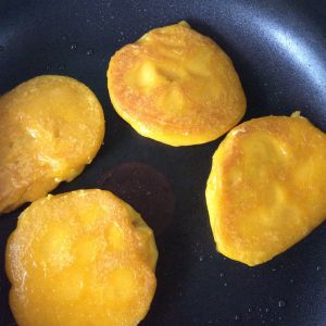弄成这样之前,要把糯米粉倒入南瓜糊里搅拌,同时可以加糖,搅拌成做面包那种面粉团,然后用不粘锅煎,加油,最好用橄榄油,个人比较觉得好吃!