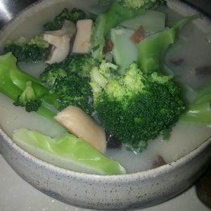 将干香菇泡软洗净切丁,皮蛋切丁,火腿肠切丁,姜切丝,蒜头切粒。坐锅,热油,先放姜丝和蒜粒爆香,后依次放入香菇丁,火腿肠,加入热水,再放入皮蛋。水开后放入西兰花,待汤再开后加入盐、鸡粉即可。喜欢的可以加入少许胡椒粉。