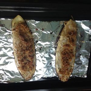 蒜切碎放一边 先把茄子烤一下一分钟即可 烤软好切 摸上色拉油