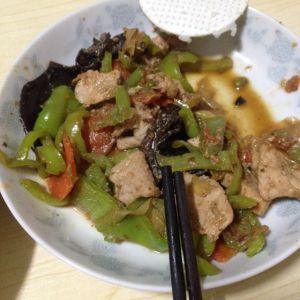 加入青椒、胡萝卜、木耳翻炒,加入少许盐,老抽,翻炒片刻,放入少许鸡精就可以盛盘了!(老公吃完了才拍的照片,亲们,第一次做这个菜,请见谅不完美的地方)