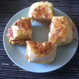 家里没有火腿了,只好用培根。煎好培根后平铺在馒头上。
