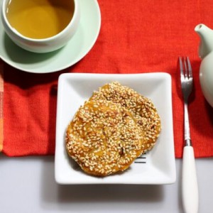 南瓜蒸熟成泥,加糯米粉拌匀揉成面团,分成若干小面团,捏扁装进玫瑰酱做馅,再揉成小球摁扁,两边沾芝麻,不粘锅放油,南瓜饼两面煎熟。