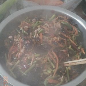 肉丝炒熟后盛盘备用,热油放葱沫,加入豆瓣酱炒至深红色,然后把菜放入锅内,加入陈醋,出锅时放事先炒好的肉丝,加入糖和水淀粉即可!