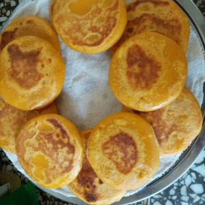 把活好的南瓜面捏成一个一个的饼,放入到不粘锅平底锅中,火开最小,记住不放油,盖上盖子慢慢煎,煎好一面再翻面。切记火一定要小!