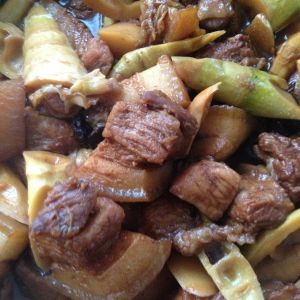 入锅,翻炒,再加一次水,末过笋和肉即可,此时放盐,适量即可,大火开锅转小火,炖十分钟。