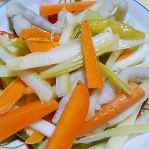 首先准备好相关材料~小米辣和泡椒要对剖切开~把蒜和姜切片,胡萝卜和西芹切条待用