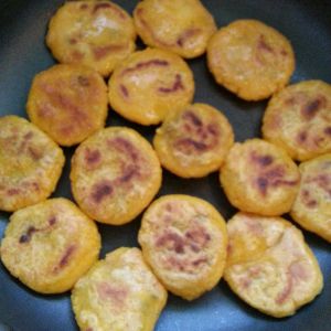 可以直接用手揉成圆球然后压扁,也可以像我这样事先做了一些豆沙馅包到里面再压扁