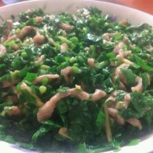 韭菜粒下锅加盐快炒几秒速度起锅淋在肉丝上;