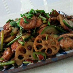 第二,把藕片,西葫芦片,香姑片,蒜苔,过水熟