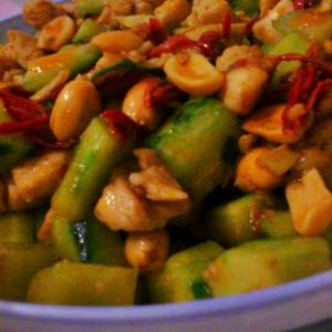 待鸡丁全面表变白后下豆瓣酱,蒜末,红椒,炒出红油,下黄瓜丁,放适量盐,糖,酱油调味。