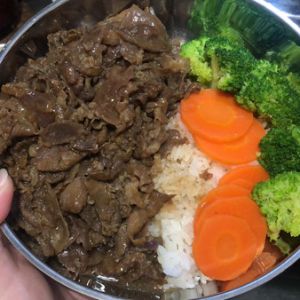 放入胡萝卜丝和肥牛!再加点照烧汁!
