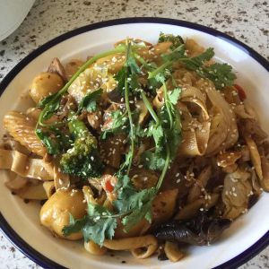 热锅冷油,放葱姜蒜爆香,随后放入半袋火锅底料炒出香味,先放入腌制的肉片翻炒变色,撒花椒,随后加入丸子,菌类,等各种食材翻炒,加一勺耗油,最后加入蔬菜类翻炒均匀淋少许麻油出锅,放香菜,撒白芝麻即可出锅享用啦。