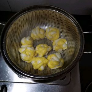 将白色面团和黄色面团分别铺开,刷油再重叠上去,滚成一团,然后切成一个一个,放蒸笼上蒸几分钟