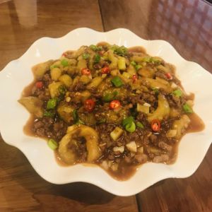 圆茄子一个去皮切成略粗的条上锅蒸15分钟取出