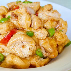 倒入豆腐泡,翻炒均匀,加入一小碗水、生抽、番茄酱、耗油,翻炒盖盖