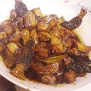 再过2分钟等料酒挥发的差不多了,放入羊肚菌,盖上锅盖小火焖30分钟(期间过来看看别让锅沾底儿,觉得颜色实在太淡可以加少许老抽)注意颜色,颜色在最后收汁的时候会增加一倍,所以千万不要在炖的时候就把颜色调到那种深色的状态,不然有可能最后收汁颜色接近黑色了哟!