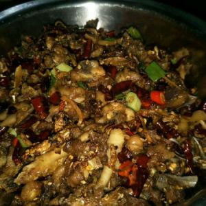 先把买回来的鸡宰成指甲盖那么大的块状,然后洗净血水,然后焯水,完了之后洗净血沫,锅里放入油比平时炒菜多一点,烧热倒入鸡块,然后小火慢煎,把鸡的水份煎干,小火可以从里到外熟透,大火容易糊,大火煎外面都糊了里面还没有熟透。小火水份煎干,然后慢慢把鸡肉煎范黄,鸡块上稍微有锅巴那种就可以放豆瓣酱,姜蒜,茴香,八角,花椒,在放入味极鲜,然后拌炒,炒到香之后放干辣椒,看差不多可以起锅了,再放入少许的盐,千万别放多,豆瓣酱和味极鲜是有味道的,然后放鸡精,味精,在放青椒和小米椒,最后的灵魂芝麻来了,哈哈哈,一定要放,把青红椒炒断生就出锅了。