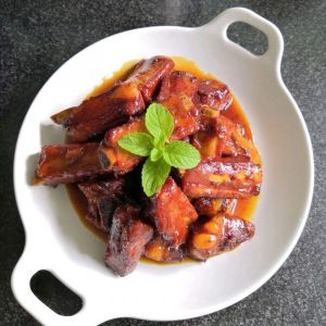 锅里放入油,下冰糖小火炒至枣红色起泡泡,下入排骨翻炒,放生姜 料酒 生抽 白糖 醋,倒入两倍的热水,小火烧四十分钟。