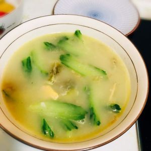 炒两三分钟后加适量开水,这个时候汤就成奶白色的了,再把黄瓜和蒜茸酥一起丢进锅里煮。