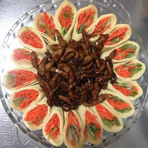 豆皮铺在菜板一端均匀码放胡萝丝和葱丝卷起