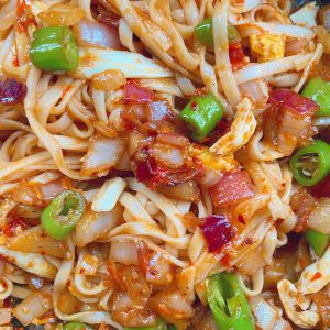 加入切好的煎蛋翻炒片刻 加滤过水的面翻炒