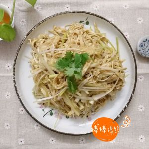 鸡丝放在盆里,把葱丝、调味料全部加进去,拌匀