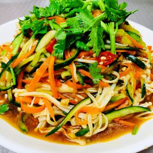 黄瓜洗净后挤干水分一起放入金针菇和胡萝卜上。
