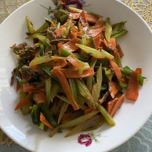 放入胡萝卜和甜椒翻炒1分钟,然后放入焯好的芹菜,加入适量生抽和盐。