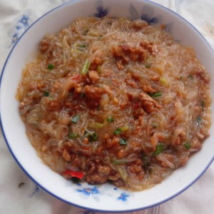 等水份将干时将芹菜末和葱尾末放入,翻炒拌匀,收汁,关火
