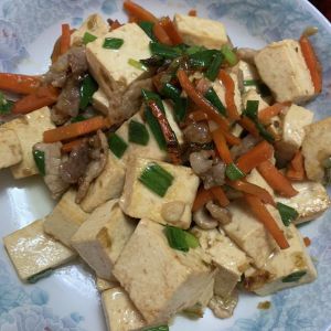 热锅下油七八分油热时加入适量葱头丝炒香 再加入五花肉炒到变色八分熟 再加入胡萝卜和适量蚝油翻炒至肉全熟 再倒入豆腐翻炒到色泽均匀 加入水(快漠过豆腐)