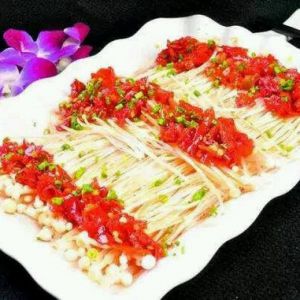 水烧开,先放入金针菇、青椒红椒丝烫30秒,捞出