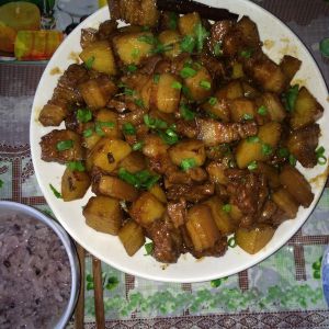 土豆切成小块放入油锅炒至发黄!捞出备用!