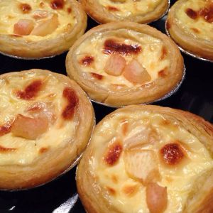 主料中的牛奶、淡奶油、炼乳+糖放小锅里煮热至白糖融化,晾凉后加蛋黄搅匀,蛋挞水就OK啦,倒入准备好的蛋挞皮中。