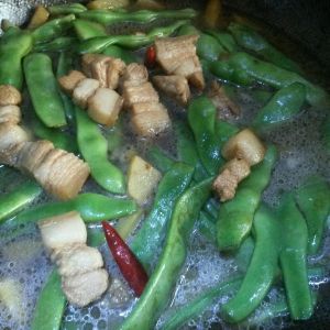 这一步我就没拍那么细的照片,热锅凉油放糖小火哦!糖化开见红放五花肉断生上色放土豆,葱,姜大料,干辣椒!调入鲜酱油和老抽料酒,翻炒片刻放入豆角断生!