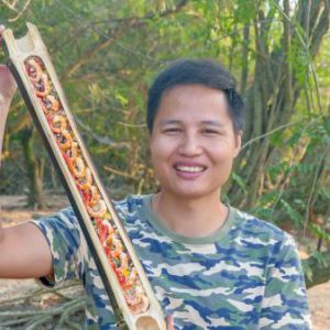 将竹筒的另一半盖上去,放在火上烘烤20—25分钟,就可以拿下来了,打开竹筒,米香扑鼻,虾仁的海味迎面而来。