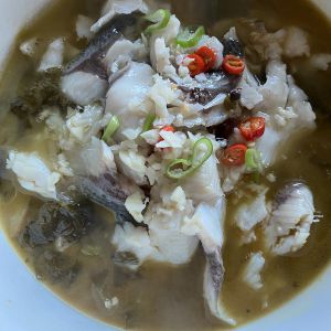 鱼骨头和酸菜(酸菜要买李锦乐宝牌的)放油锅一起炒,加半碗水,煮沸盛起
