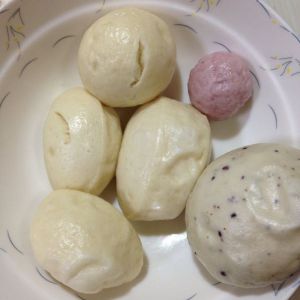 可以揉面了,这次最好多揉一会,面会比较筋,气孔也会小一点,均匀一点。揉好了,醒一会面,所谓醒,我理解的就是让面或者酵母和面充分的起化学反应,和周围的小伙伴融为一体。醒面就是把面揉好了放在那,最好还是放锅里,这回不可以放热水。十分二十分钟都可以,这回可以做造型了。我还分别做了紫薯的和蓝莓的,不过这个最好在最开始和面的时候就加里,不然很容易不成功。你可以展开你的想象力做造型,也可以包糖三角,中间放红糖,或者豆沙。做好了放屉里醒20分钟,这时用蒸锅烧水,大概水7成要开的时候放上蒸就可以了