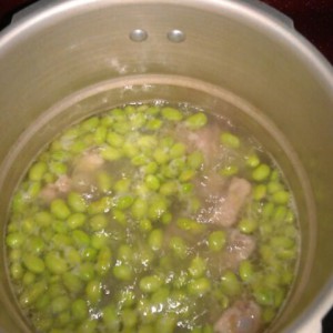 压力锅冷却后打开锅盖,加入适量的盐和毛豆,放火上煮至毛豆熟,此步切忌盖压力锅盖,否则毛豆就不脆了。
