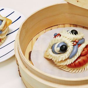 ■制作出一个椭圆形,当做头部大概20g,搓出一根长条盘绕在头部大概7g,眼睛用4片圆形叠加,最后上面放一个黑色圆形眼珠,和白色高光,黑色用白色面加一点黑米面或者墨鱼汁,竹炭调的色。