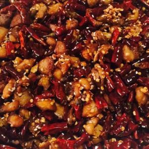 放入鸡腿丁翻炒 将辣味炒入鸡腿丁 最后加少许白糖调味 再撒上一把芝麻 这个时候 闻到香味你一定会流口水 我就是这样