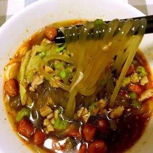 粉条沥干水分放入做好的酸辣粉汤里,加一勺蒜水、一勺辣椒油,蒜和辣椒油可以按自己口味增减,最后放入烫好的青菜,香菜碎或者香芹碎,熟花生米。花生米我是用生烤箱170度6分钟烤熟烤香的,也可以用炒锅炒熟注意火候。