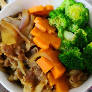 米饭,肥牛,西蓝花,胡萝卜,摆放随喜…最后再在蔬菜上浇一点汁儿~吃去吧