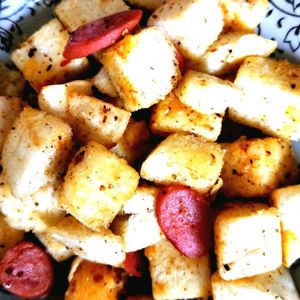 放入火腿,撒椒盐,辣椒粉,盐,待馒头丁表面酥脆时就可以关火出锅了。