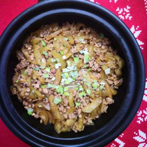 冷锅热油,下蒜末,炒香后加入肉沫,倒入调好的料汁