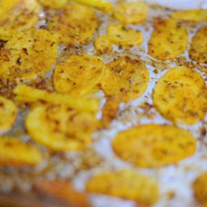 把土豆一片片铺上去,然后撒一点孜然。你也可以不撒,因为之前已经放了孜然,但是我爱吃呀,就放了一点。