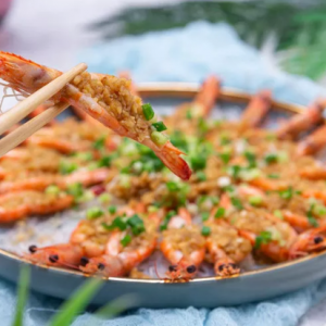 第八步:把泡好的粉丝铺在盘子底部,再将虾放在粉丝上面。