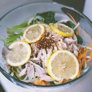 等鸡肉凉后撕成丝,把所有材料放一起,柠檬片装饰,剩余的柠檬挤汁,捞拌汁也倒入。撒上适量的辣椒油(或小辣椒圈)和白芝麻。
