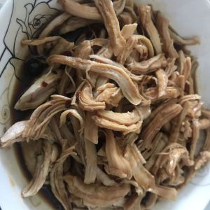 两勺生抽,两勺蚝油,一勺糖,一勺醋,半勺辣椒酱调成酱汁,浇到鸡丝上拌匀