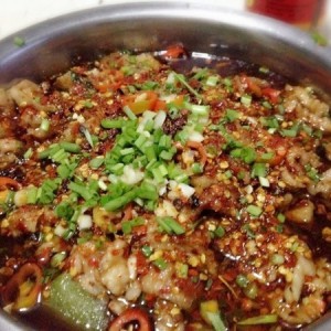 在肉上放剩下的一半蒜,辣椒面,淋上热油,再洒上花椒面,小葱。