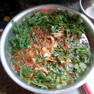 捣碎得辣椒,还有切好得蒜,香菜,小葱大葱切成段,放置一旁备用,图中香菜还未切